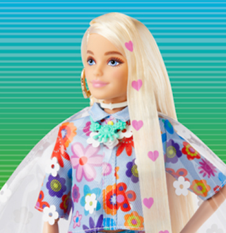 Barbie® are un par blond foarte lung cu detaliu de impletitura si inimioare mov. Isi expune stilul increzator intr-o bluza de culoare aprinsa cu imprimeu floral si un poncho flower-power translucid. |